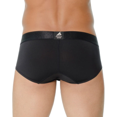 A microfibre brief in black with a black elastic waistband stitched with the Inizio brand name in grey. Material Composition: 75% Polyamide, 25% Spandex.